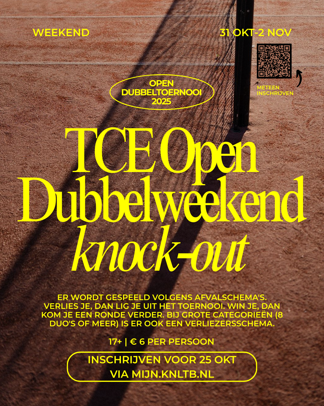 Dit najaar organiseert de technische commissie voor de eerste keer een weekendtoernooi voor dubbels. En niet zomaar één, maar een knock-out toernooi. Win je, dan kom je een ronde verder. Verlies je, dan lig je uit het toernooi. Voor degenen met een drukke agenda is dit weekendtoernooi ideaal: je hoeft niet een hele week vrij te houden, maar alleen het weekend.